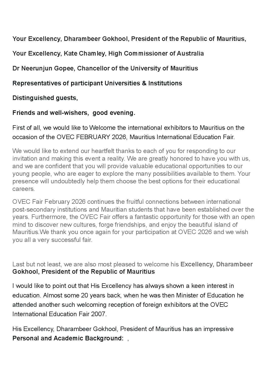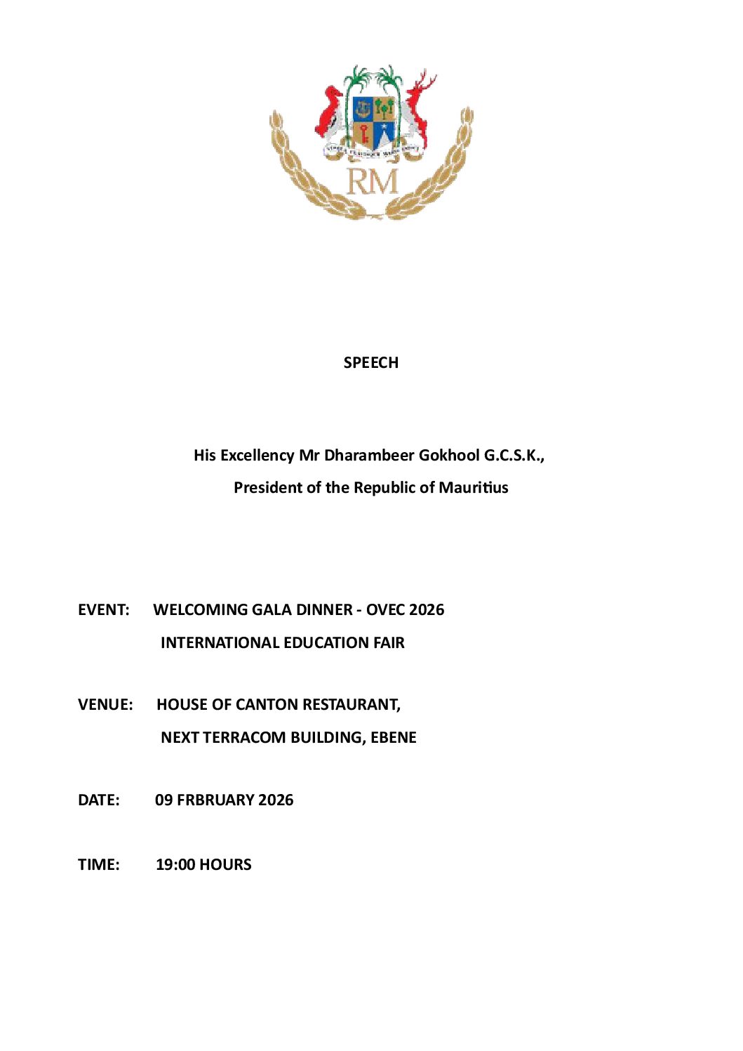OVEC EDUCATION FAIR 2026 WELCOMING GALA DINNER GRACED BY THE PRESIDENT OF THE REPUBLIC OF MAURITIUS April 10, 2026